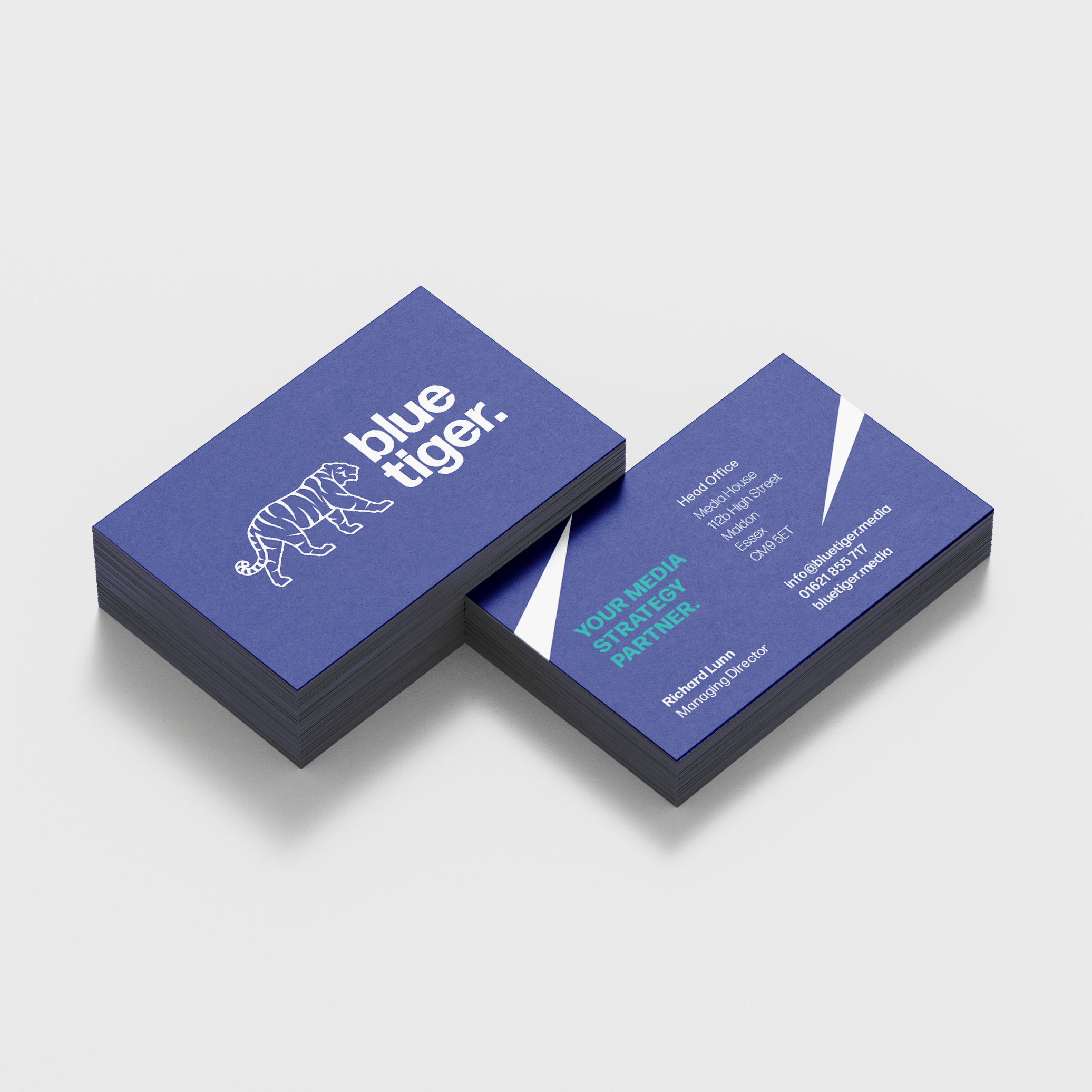 The Blue Tiger business cards are produced using a duplex, uncoated card stock, giving them a substantial weight and a refined, tactile finish. This material choice enhances the brand’s premium feel while maintaining a clean, understated aesthetic. The letterhead continues this approach, printed on high-quality paper stock and finished with a debossed logo that adds subtle depth and sophistication.