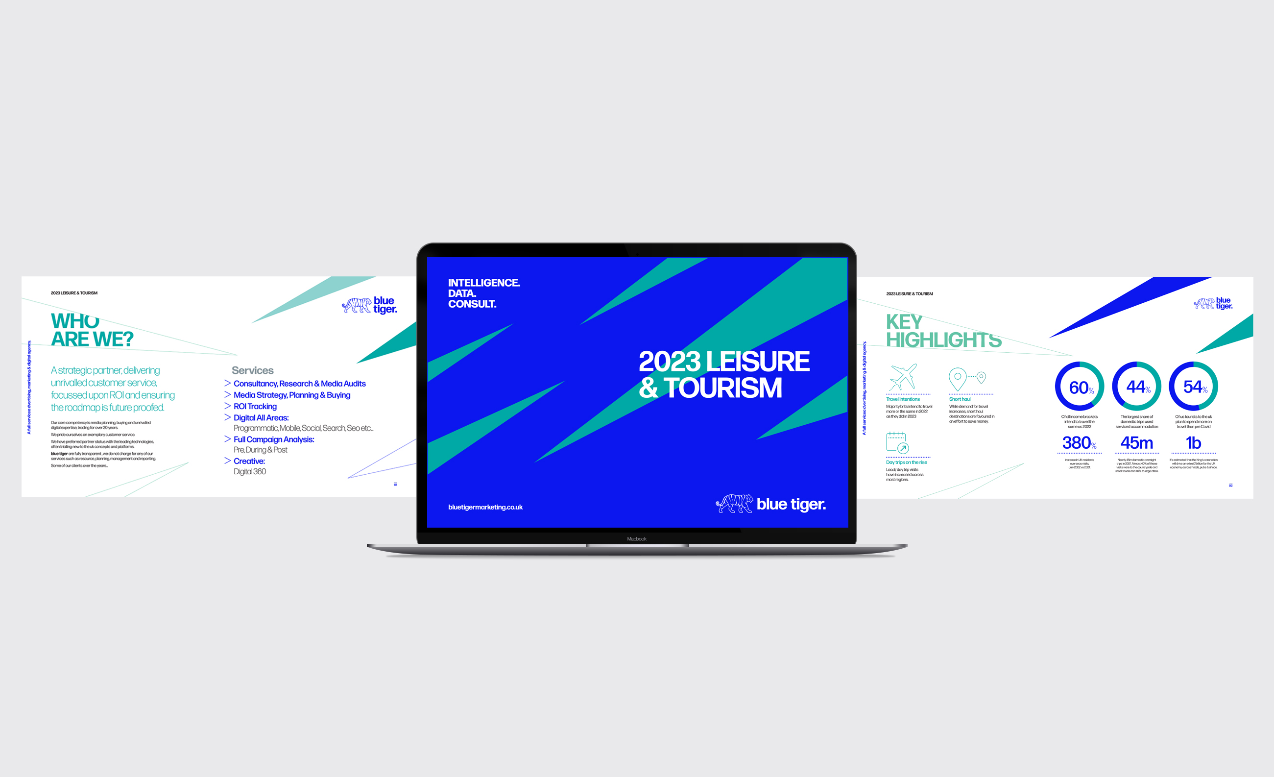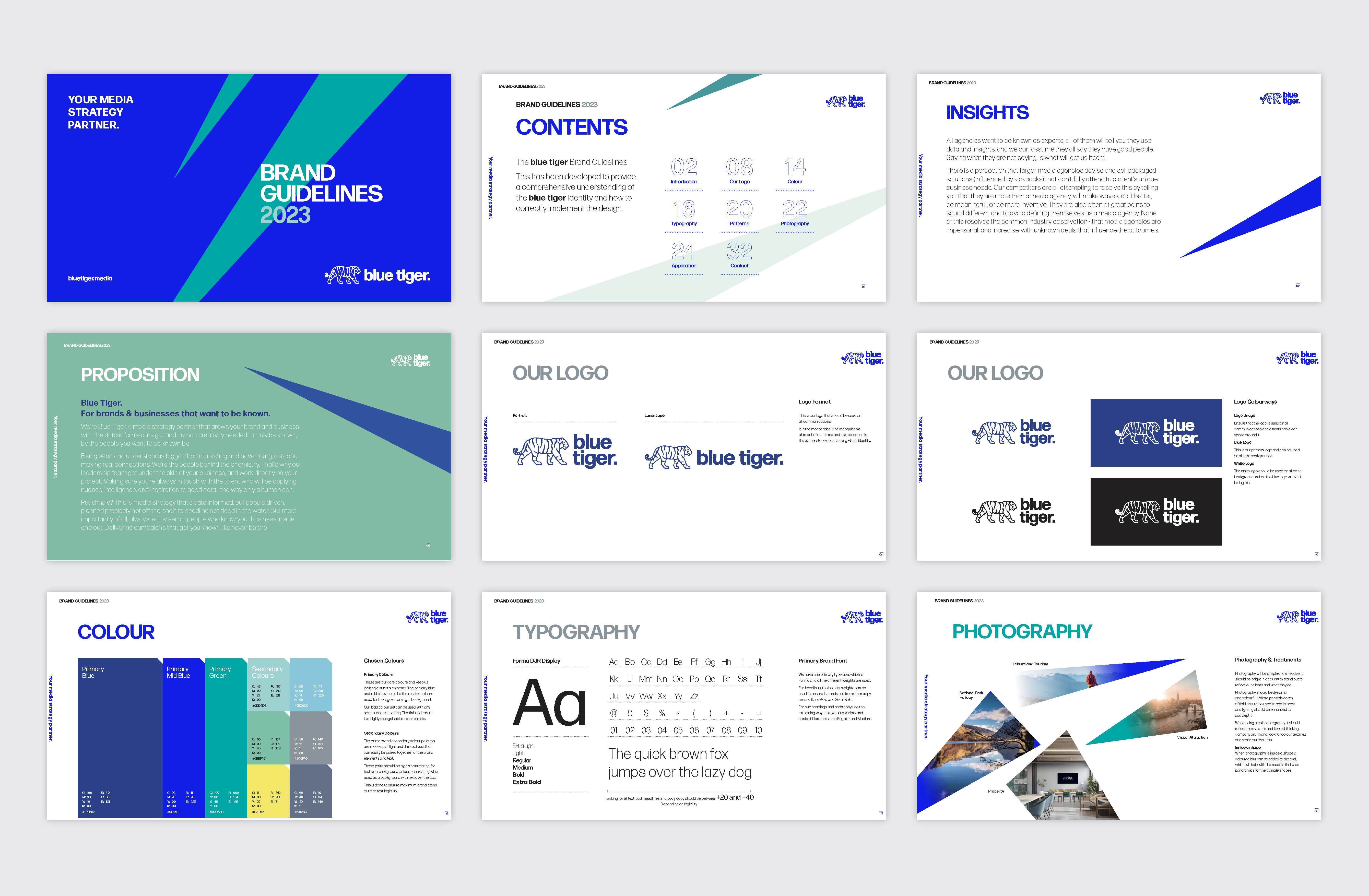 The guidelines were developed as an evolution of Blue Tiger’s previous branding. The result is a refined design approach, incorporating updated typography, a modernised logo, angular shapes inspired by the tiger-stripe identity, and a bold colour palette set within a spacious, contemporary layout. The guidelines are designed to be versatile.
