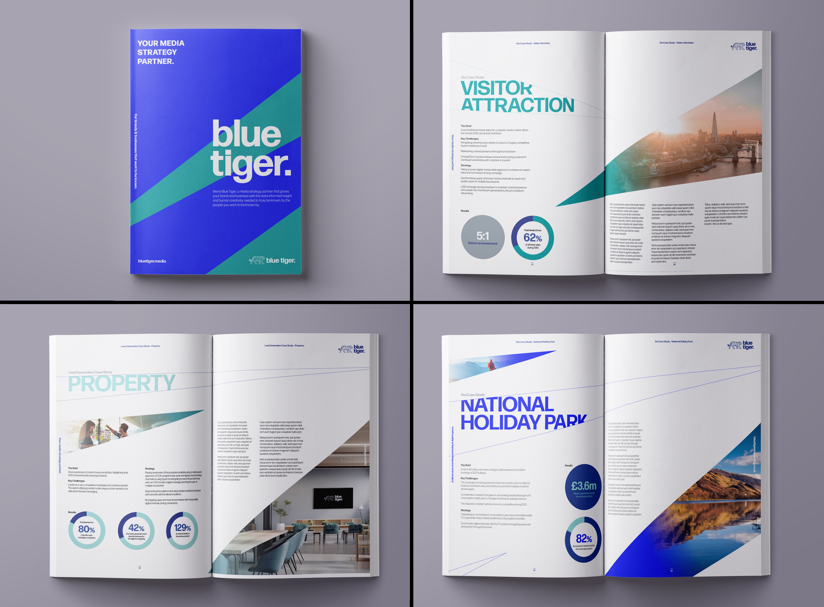 The brochure was designed as a strong introduction to the company and the sectors it operates in, clearly communicating Blue Tiger’s expertise and impact. Case studies and bold, infographic-style statistics showcase measurable results delivered for clients, reinforcing credibility and performance. The tiger-stripe motif is used as a distinctive visual device to frame imagery, creating dynamic, high-impact spreads that bring the brand to life.