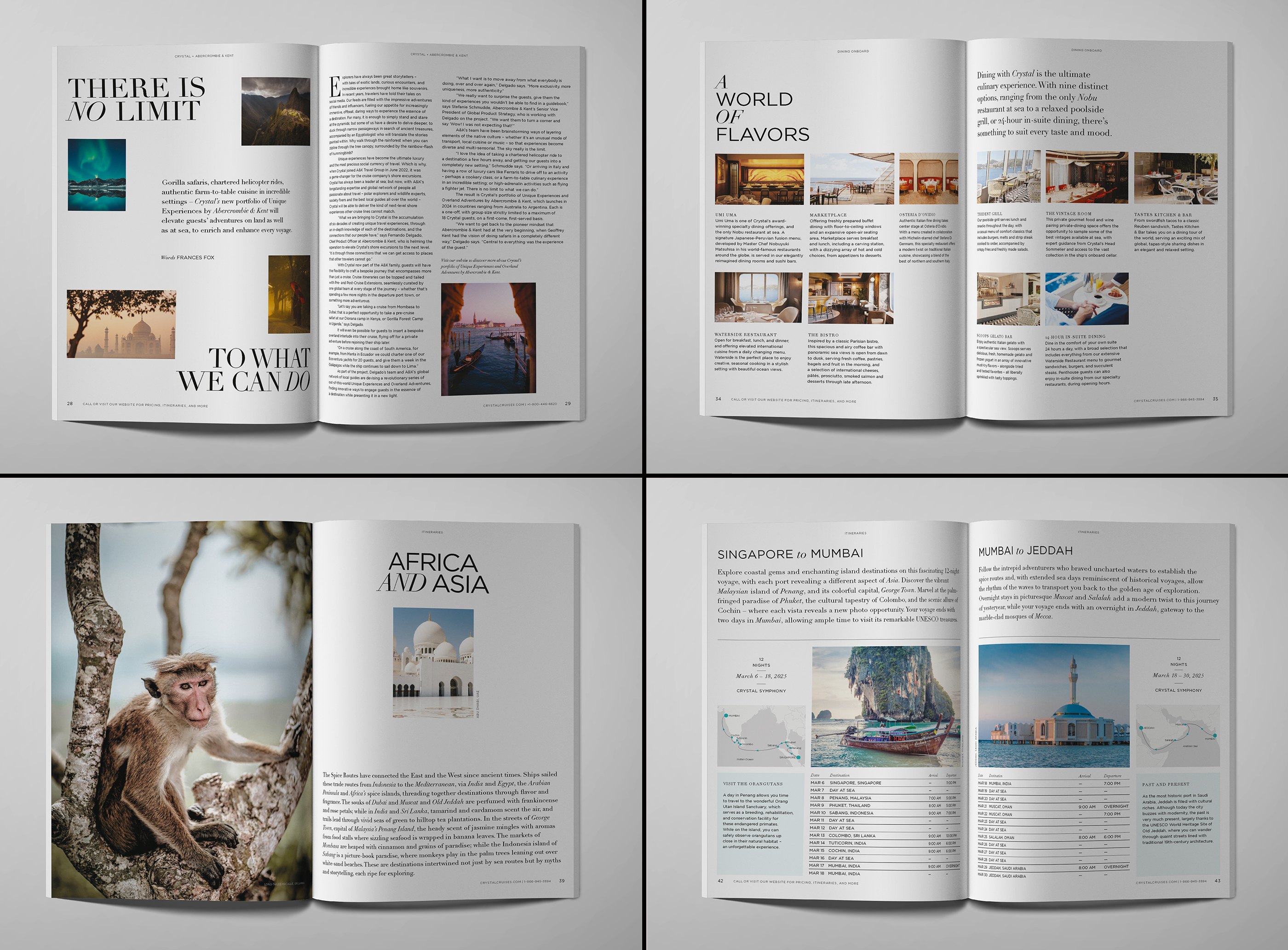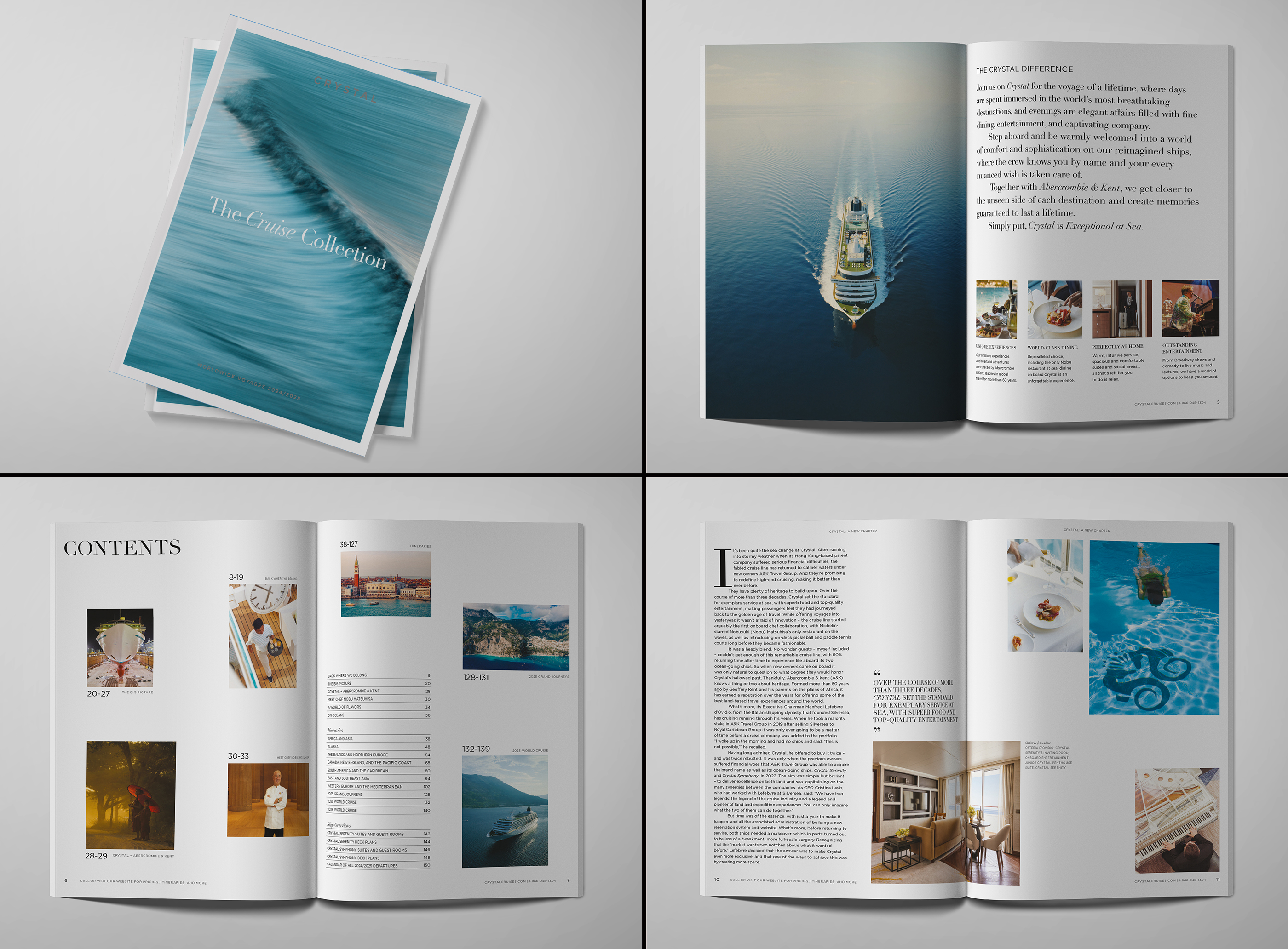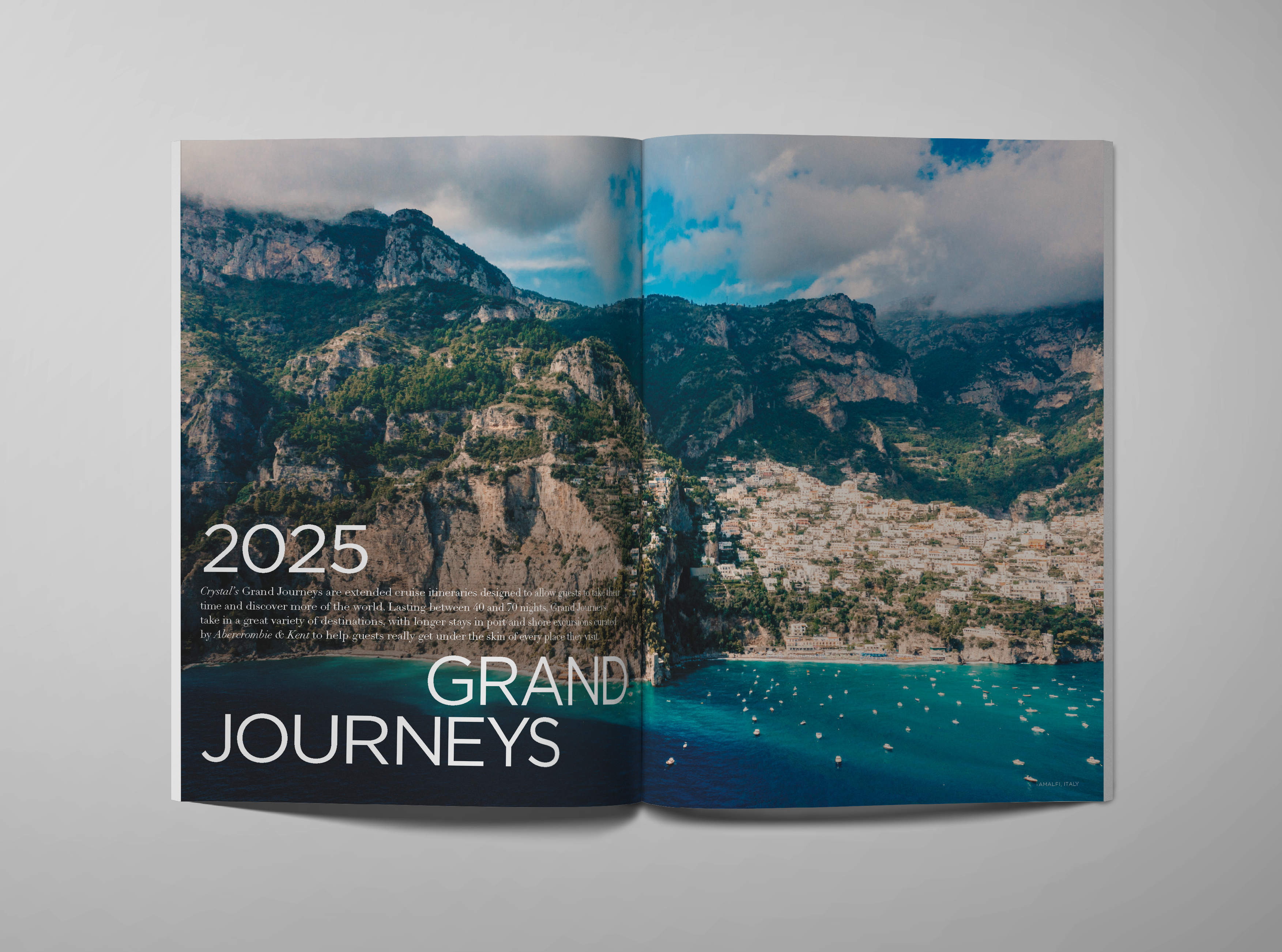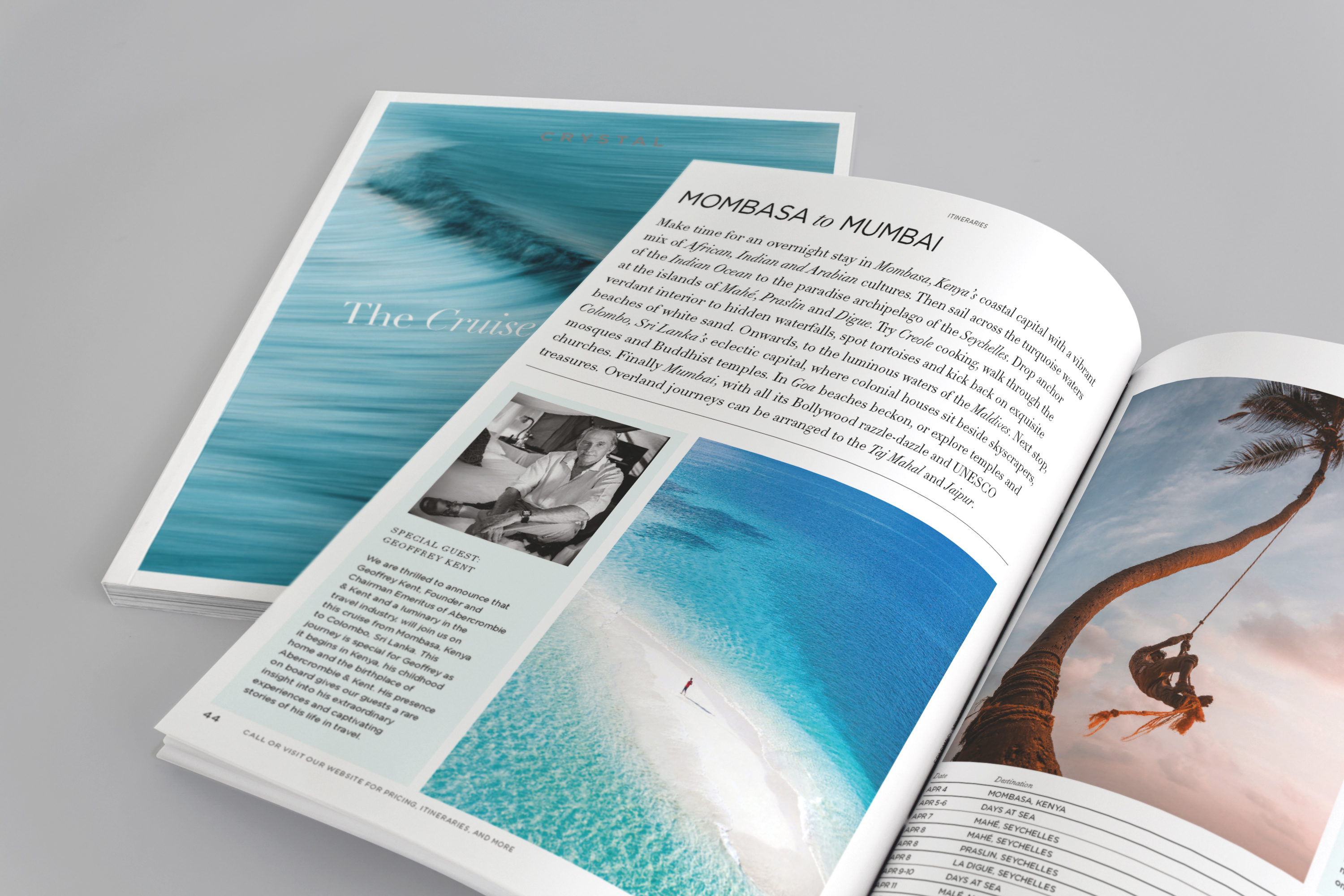 To inspire prospective guests through a curated selection of luxury journeys, from breathtaking tropical hideaways and remote escapes to culturally rich and spiritually immersive experiences. The brochure will feature stunning destination photography, carefully crafted itineraries, an introduction to the ship, and exquisite print finishes that reflect the elegance and quality of the Crystal brand.