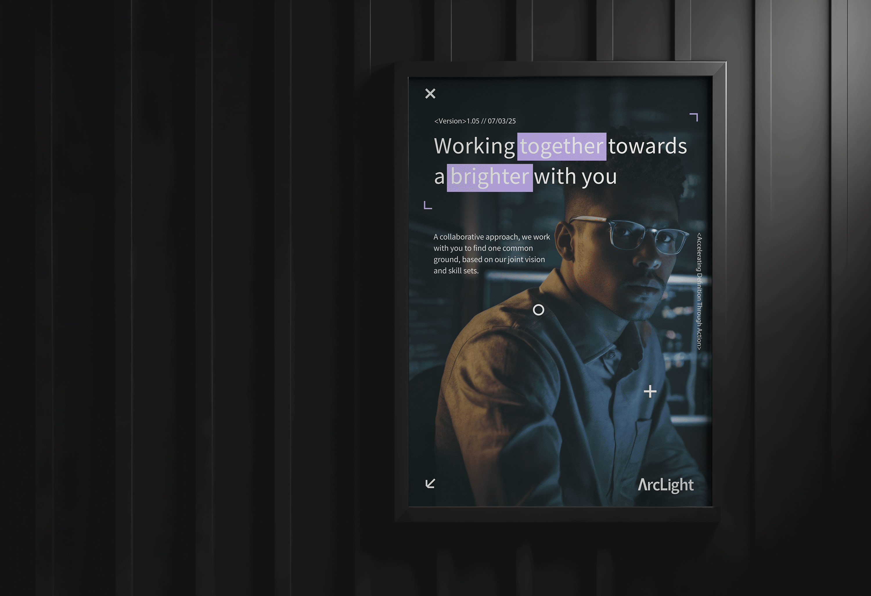 The visual identity – spanning the logo, colour palette, motion design, digital experience, and tone of voice – was developed to reflect Arclight’s mission and ensure the brand stands out in a competitive market. The brochure translated these elements into a contemporary design, incorporating coding-inspired typography, image masks and custom icons to create a distinctive and engaging visual language.